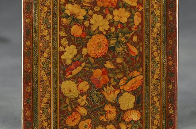 Miroir rectangulaire en « papier mâché » peint et laqué, signé sur le couvercle : kamtarin Mohammad Bâqer (le moindre Mohammed Bâqir) et chiffres au revers : 11 701, probablement la date 1170H. ou 1171H./ 1756-58.