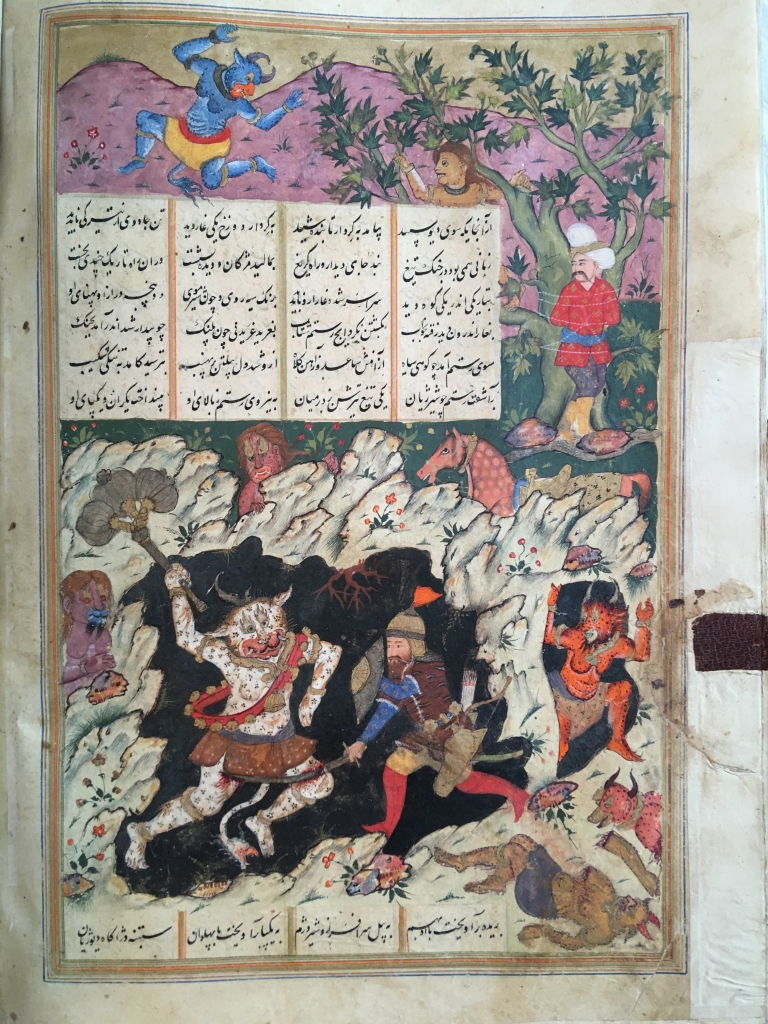 Fol. 14r : Fereydoun emmène Zahhak prisonnier ; Fol. 47v : Rostam combat l’éléphant blanc ; Fol. 63v : Rostam combat Afrasiyab ; Fol. 73v : Rostam combat le Div blanc devant Awlad captif ; Fol. 98v : Rostam et Sohrab ; Fol. 155r : Siyavash décapite son ennemi au cours d’une bataille ; Fol. 189v : Le combat de Foroud contre Giv ; Fol. 239r : Rostam combat Pouladvand ; Fol. 242r : Le Div Akvan s’apprête à jeter Rostam dans la mer ; Fol. 260v : Rostam combat le Div noir ; Fol. 291v : Gourdaz combat Piran ; Fol. 308v : Kay Khosrow tue Shideh ; Fol. 334r : La mort d’Afrasiyab ; Fol. 386v : Esfandiyar tue deux loups ; Fol. 429v : Rostam et Esfandiyar ; Fol. 439r : Rostam et Rakhsh tombent dans le piège de Shaghad ; Fol. 597r : L’armée de Khosrow Anoushirvan attaque une forteresse byzantine ; Fol. 656v : Le roi sassanide Hormozd envoie un rouet a Bahram Chubineh ; Fol. 708v : L’assassinat de Khosrow par Mehr Hormozd sur l’ordre de son fils ;Fol. 716r : Le combat du général sassanide Rostam contre Sa’ad.
