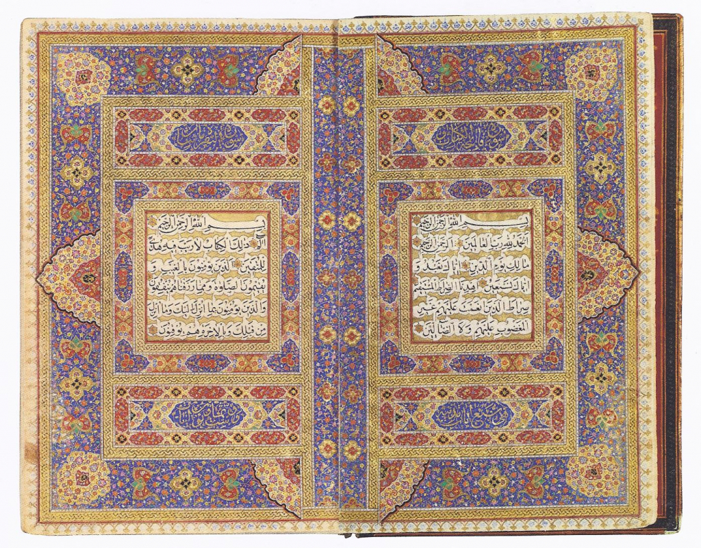 Manuscrit de 152 folios sur papier, texte à l’encre noire de 25 lignes par page entourées de nuages dorés, dans un encadrement doré. Rosettes de verset dorées et nombreux médaillons marginaux. Enluminé de deux doubles frontispices : le premier composé de deux mandorles rouges inscrites d’une prière à l’encre dorée sur un fond de semis d’enroulements floraux ; le deuxième frontispice inscrit des deux premières Sourates, dans un très riche encadrement enluminé d’arabesques florales sur fond bleu. Nombreux testes marginaux devant les titres de Sourates calligraphiés en nasta’liq dans des cartouches enluminés, relatifs à la récitation.