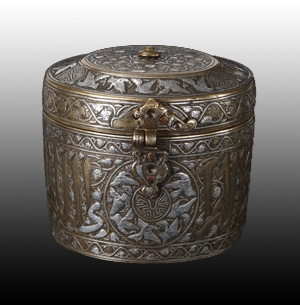 Rare et belle boîte cylindrique munie d’un couvercle à gorge, en laiton incrusté d’argent et finement ciselé. Le dessus du couvercle est décoré d’un bandeau trilobé de rinceaux floraux autour d’une prise en bouton, et la gorge d’une frise de quinze canards en vol interrompus par trois petits disques meublés de svastikas. La base du couvercle est ornée d’une frise de rinceaux. Le corps est décoré d’une large inscription souveraine anonyme calligraphiée en écriture naskhi sur fond d’enroulements de rinceaux, interrompue par trois grands rondeaux où s’ébattent huit canards autour d’un disque meublé de svastikas. Deux frises de rinceaux ceinturent le bandeau calligraphié. Le couvercle est maintenu par une charnière et un fermoir fixés par des clous en cuivre rouge, probablement remontés ultérieurement. Plaques d’argent partiellement désincrustées.
