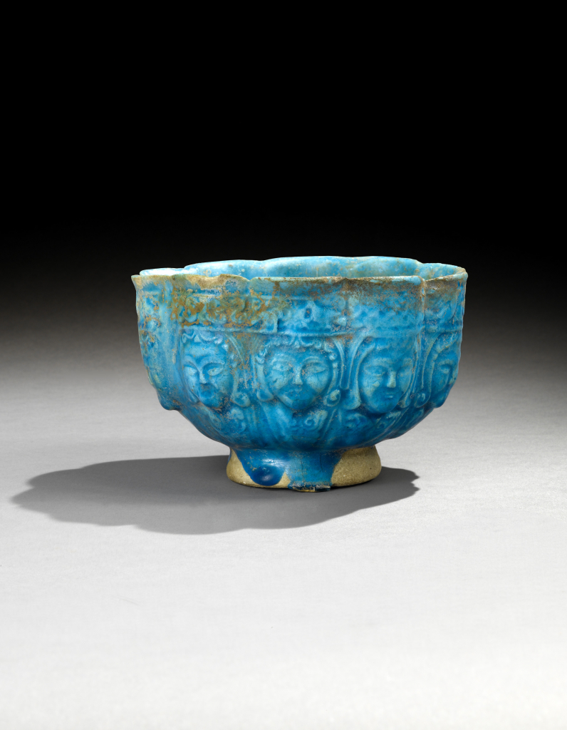 Two other bowls almost identical to this one are known to be in existence, one in the Khalili Collection (Ernst Grube, Cobalt and Lustre: The First Centuries of Islamic Pottery, the Nasser D. Khalili Collection of Islamic art, vol. IX, 1994, n° 172 p. 176) and the other in the Tareq Rajab museum in Kuwait (Géza Fehérvári, Ceramics of the Islamic world in the Tarek Rajab Museum, London & New York, 2000, n° 111 p. 101). Peter Morgan classifies them in group I of “moulded ceramics with a monochrome glaze” and attributes their likely provenance to Nishapur, based on the fact that a mould used in their manufacture was found on site, in the kilns (Peter Morgan, “Iranina stone-paste pottery of the Saljuq period; Types and Techniques”, in Grube, op. cit., 1994, p. 158). A half mould of this type, with several negative moulded faces, is also held in the Khalili Collection (Grube, op.cit., 1994, n° 175 p. 178) and a superb matrix of a bowl with ten lobes, believed to come from Ghazni in Afghanistan, is now held in the national museum of Kuwait (Oliver Watson, Ceramics from Islamic Lands, Kuwait National Museum, The al-Sabah Collection, London, 2004, n° Af.3 p. 140). On this matrix, used to manufacture negative moulds, one can admire the precision of the decoration where each decorative element (head, crown, palmette) is unique.