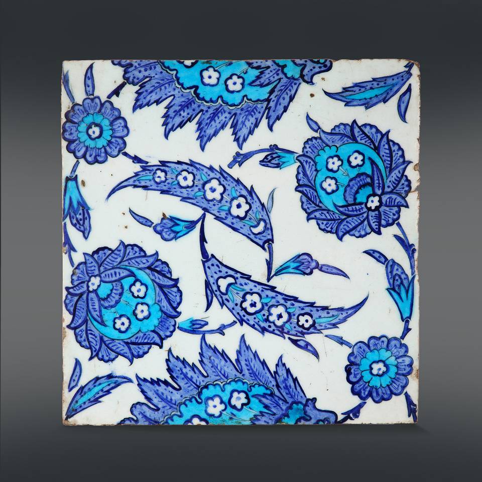 Les couleurs turquoise et cobalt de ce carreau rappellent les productions de carreaux ottomans du deuxième quart du XVIe siècle, et ils sont parfois d’ailleurs catalogués vers 1545-50. Mais la composition et les branches d’églantine à l’intérieur des fleurs incitent à dater ce groupe de carreaux vers 1570. Un carreau de la même série s’est vendu chez Artcurial, Arts d’Orient et de l’Islam, 11 avril 2013, lot  137.  Un autre carreau similaire était exposé à Londres , voir le catalogue d’exposition par  E. Grunberg – E.M. Torn, Four Centuries of Ottoman Taste, The Kyburg Gallery, London, 1988, n°16 et illustré au dos du catalogue. Et également : Couleurs d’Orient – Arts et arts de vivre dans l’Empire ottoman, Catalogue d’exposition, Villa Empain, Fondation Boghossian, Bruxelles, 18 novembre 2010 – 27 février 2011,  p.47.
