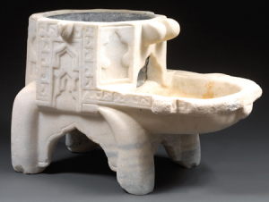 Support de jarre en marbre blanc sculpté, reposant sur quatre pieds galbés. Cuveau hémisphérique à bord octogonal, les angles à pans coupés convexes ; il est muni de deux avancées dominant un bassin à cuvette semi-circulaire. Les côtés sont ornés de mihrabs et d’un long bandeau calligraphié en coufique ceinturant un mihrab. L’inscription n’a pas été déchiffrée.