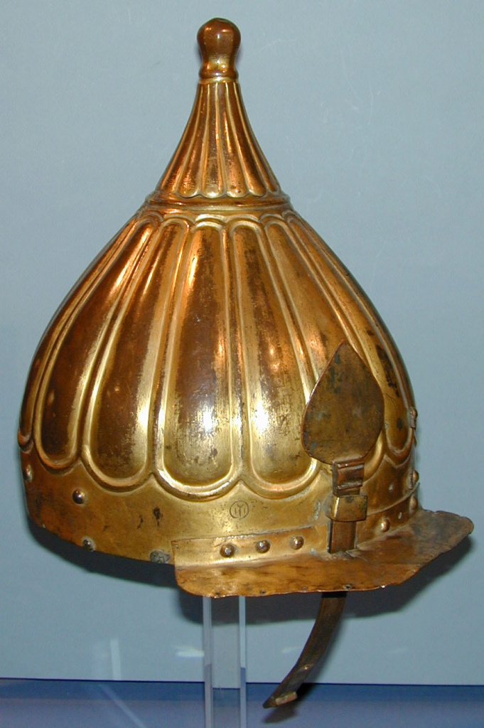 Gilt copper turban helmet with gadrooned brim, nose-guard and visor. The helmet bears the St Irene armoury mark in Istanbul.
