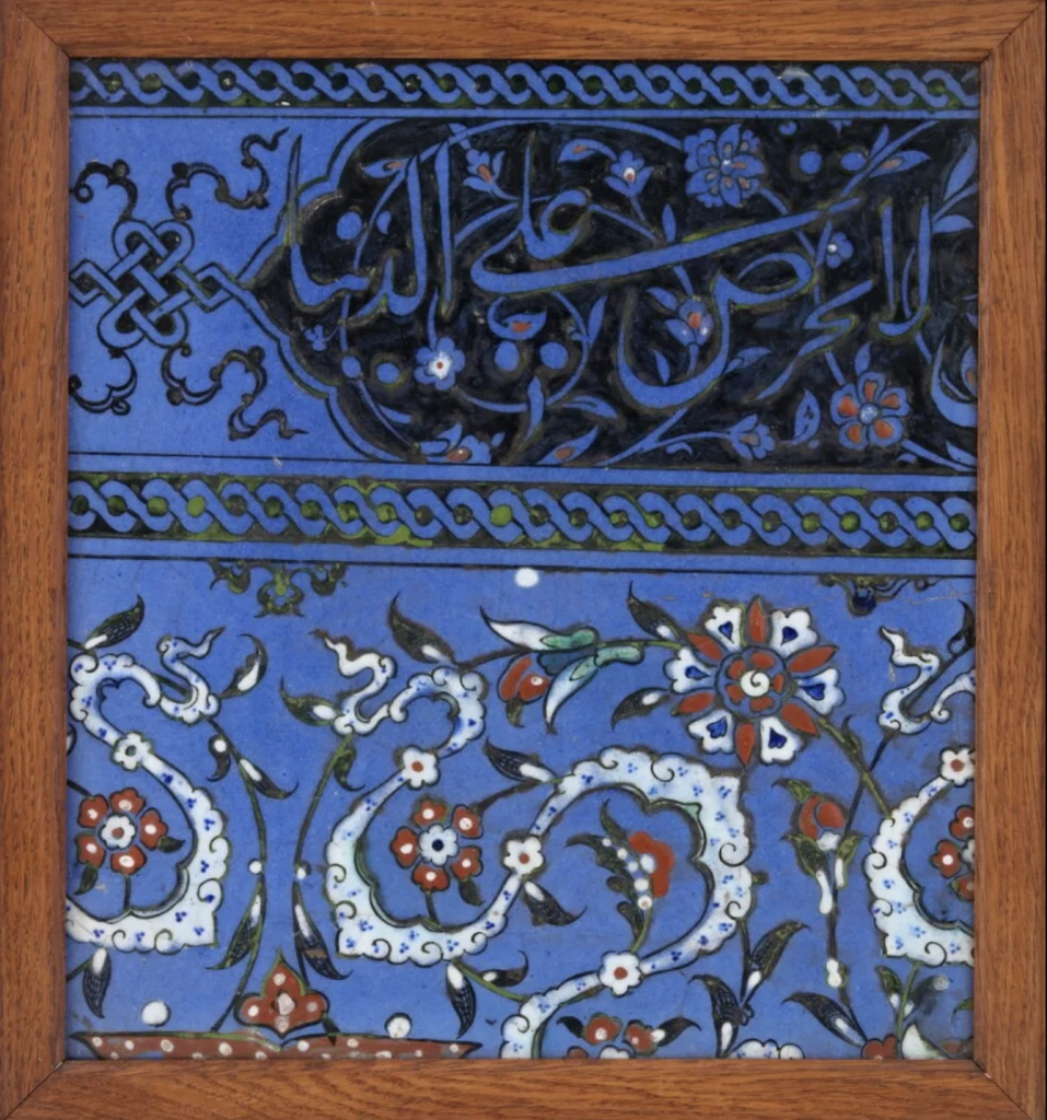 Very rare and large Iznik tile decorated over a lavender blue ground, with a calligraphic cartouche containing an Arabic inscription in nasta’liq Ottoman Turkey, Iznik, circa, 1560-65