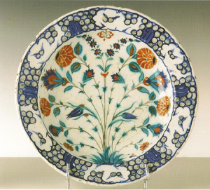 Plat à bord chantourné en céramique siliceuse à décor peint en polychromie sous glaçure incolore. Il est orné d’une composition symétrique dite « aux quatre fleurs » d’œillets, tulipes, jacinthes et églantines, couronnée d’une fine arabesque rouge. Le revers est agrémenté de rosettes et de paires de tulipes en alternance. Un trou de suspension rebouché à l’aile ; trois trous dont un rebouché au talon ; petit éclat manquant et petites égrenures au rebord ; glaçure craquelée.